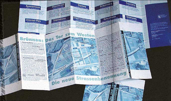 Informations-Faltprospektüber die geplante Strassenbenennung im neuenStadtteil Brünnen, Bern. Konzept, Gestaltung und Typograhie.