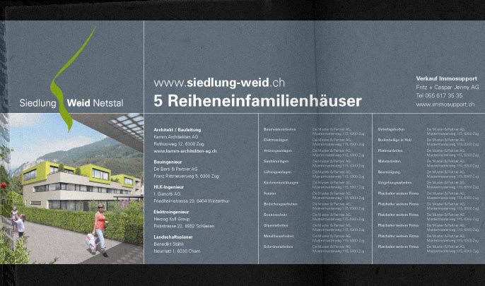 Visuelles Erscheinungsbild undWerbung für eine Wohnsiedlung in Netstal bei Glarus. Entwurf für eine Info-Tafel auf dem Bauplatz.
