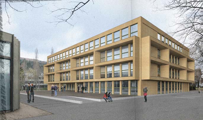 Visualisierung für einen Architekturwettbewerb in Biel. (Neubau Kantonale Schulanlage Standboden, Stadt Biel). 3D-Gebäudemodell, Digitalphotographie und Bildmontagen.