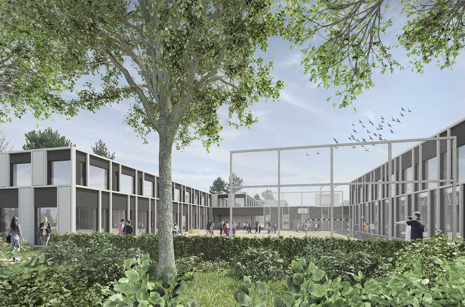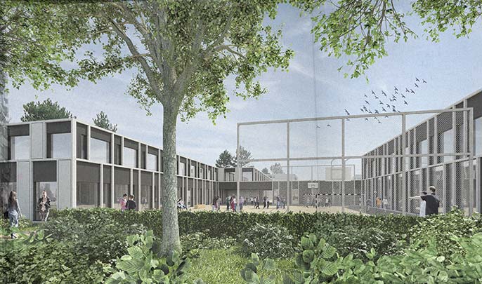 Visualisierung für einen Architekturwettbewerb Bümpliz bei Bern. (Heilpädagogische Schule Bern) 3D-Gebäudemodell, Rendering und Bildmontagen.