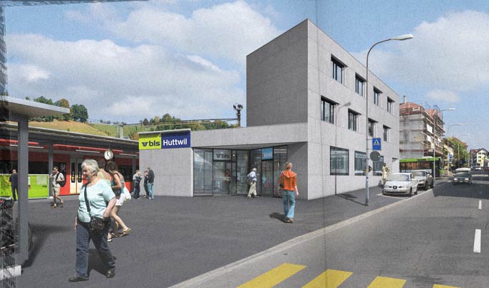 Visualisierung für einen Architekturwettbewerb in Huttwil. (Ausbau Bahnhof BLS). 3D-Gebäudemodell, Digitalphotographie und Bildmontagen.