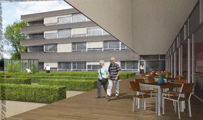 Visualisierung für einen Architekturwettbewerb in Langenthal. (Alterszentrum Haslibrunnen). 3D-Gebäudemodell, Digitalphotographie und Bildmontagen.