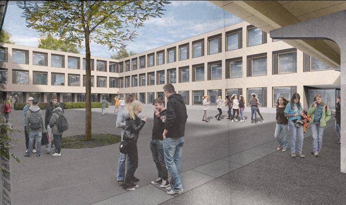 Visualisierung für einen Architekturwettbewerb inder Stadt Bern.(Umbau und ErweiterungManuel Schulhaus). 3D-Gebäudemodell, Digitalphotographie und Bildmontagen.