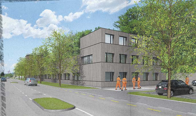 Visualisierung für einen Architekturwettbewerb inMünsingen bei Bern. (Neubau Kantonaler Werkhof). 3D-Gebäudemodell, Digitalphotographie und Bildmontagen.