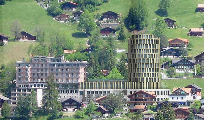 Projektstudie Erweiterung Hotel Belvedere, Grindelwald Visualisierung verschiedenerProjektvarianten(hier die Variante «Turm»). 3D-Gebäudemodell und Bildmontagen.
