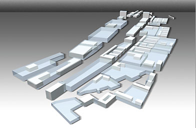 Visualisierung für einenstädtebaulichen Wettbewerb, Malley, Lausanne. 3D-Volumenmodell, Bildmontagen und Bildbearbeitung.