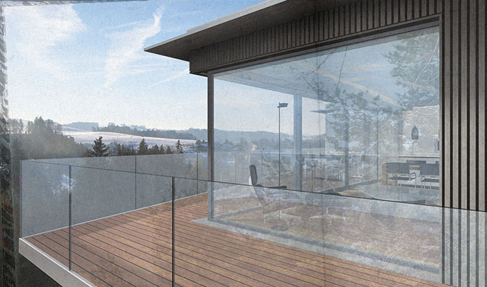 Visualisierung eines Doppeleinfamilienhauses in Niederscherli (BE). Bilder für Verkaufsdokumentation: Aussicht vom Attikageschoss. 3D-Gebäudemodell, Bildmontagen mit Umgebungsfotos.
