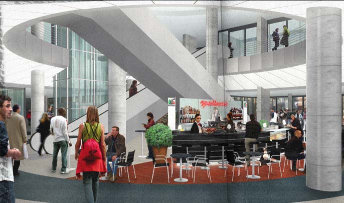 Visualisierung eines Mallcafes im Stade de Suisse, Bern. (Wettbewerb)3D-Gebäudemodell, Digitalphotographie und Bildmontagen.