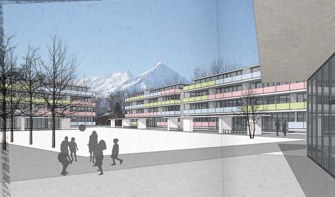 Visualisierung für einen Architekturwettbewerb in Interlaken (Wohnsiedlung). 3D-Gebäudemodell, Bildmontagen mit abstrakten und fotorealistischen Elementen. > mehr (Bild 2)