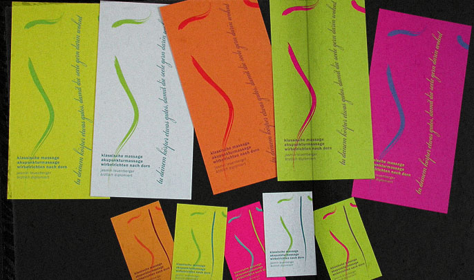 Kartenserien für eine Massagepraxis. Werbekarten, Neujahrskarten Visitenkarten und Gutscheine. Konzept, Gestaltung und Illustrationen.