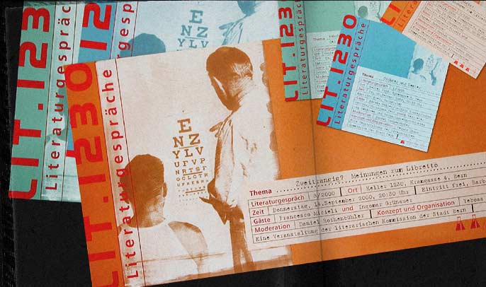 Plakate und Flyerfür Litraturgespräche im Theater 1230 in Bern. Konzept, Typographie und Bildkompositionen.
