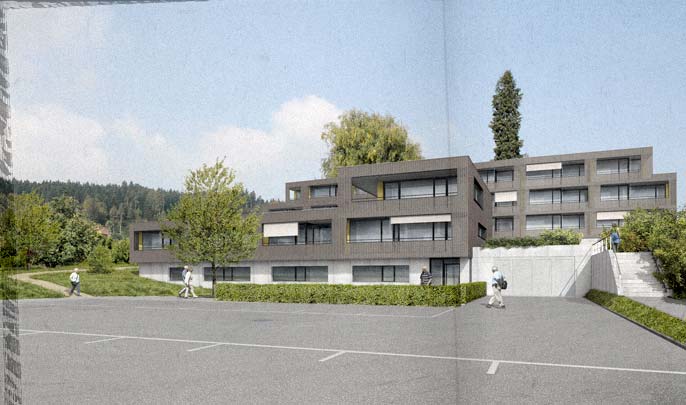 Visualisierung für einen Architekturwettbewerb inMeikirch (Alterswohnen).3D-Gebäudemodell, Digitalphotographie und Bildmontagen.