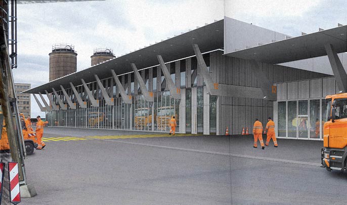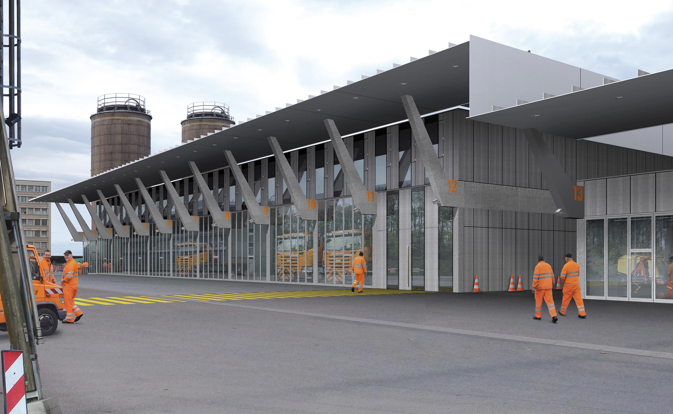 Visualisierung für einen Architekturwettbewerb inder Stadt Bern. (Ergänzung, Umbau und Neubau Werkhof ASTRA). 3D-Gebäudemodell, Digitalphotographie und Bildmontagen.