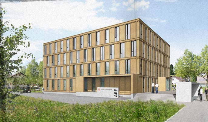 Visualisierung für einen Architekturwettbewerb inIttigen / Bern.(Neubau Bürogebäude Bundesamt für Raumentwicklung). 3D-Gebäudemodell, und Bildmontagen.