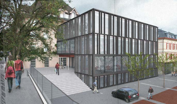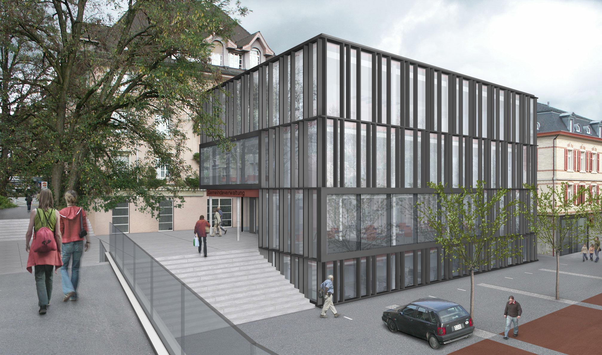 Visualisierung für einen Architekturwettbewerb inMeilen ZH (Dorfzentrum, Gemeindeverwaltung). Aussenansicht Neubauteil und Platzgestaltung. 3D-Gebäudemodell, Digitalphotographie und Bildmontagen.