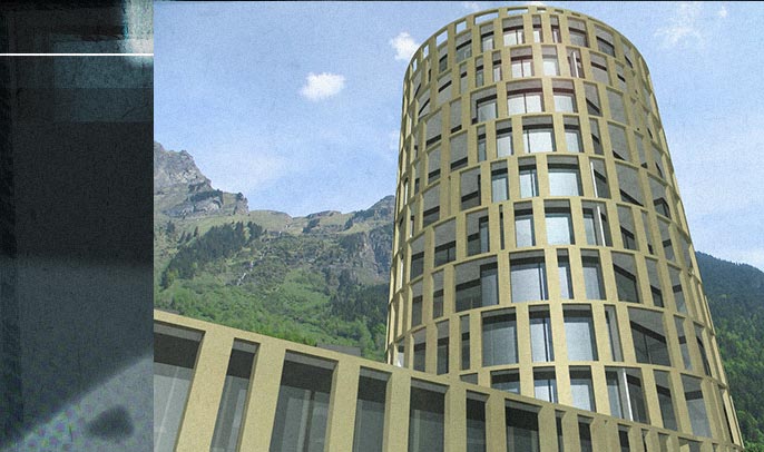 Projektstudie Erweiterung Hotel Belvedere, Grindelwald Visualisierung verschiedenerProjektvarianten(hier die Variante «Turm»). 3D-Gebäudemodell und Bildmontagen.