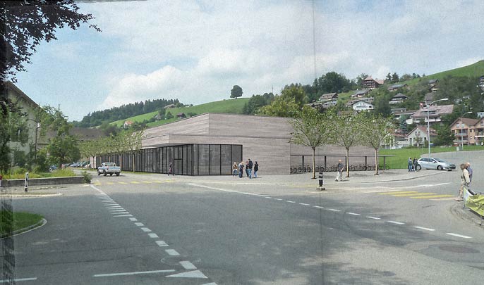 Visualisierung für einen Architekturwettbewerb in Langnau, Aussenansicht. (Neubau Dreifach-Turnhalle) 3D-Gebäudemodell, und Bildmontagen. > zurück (Bild 1)